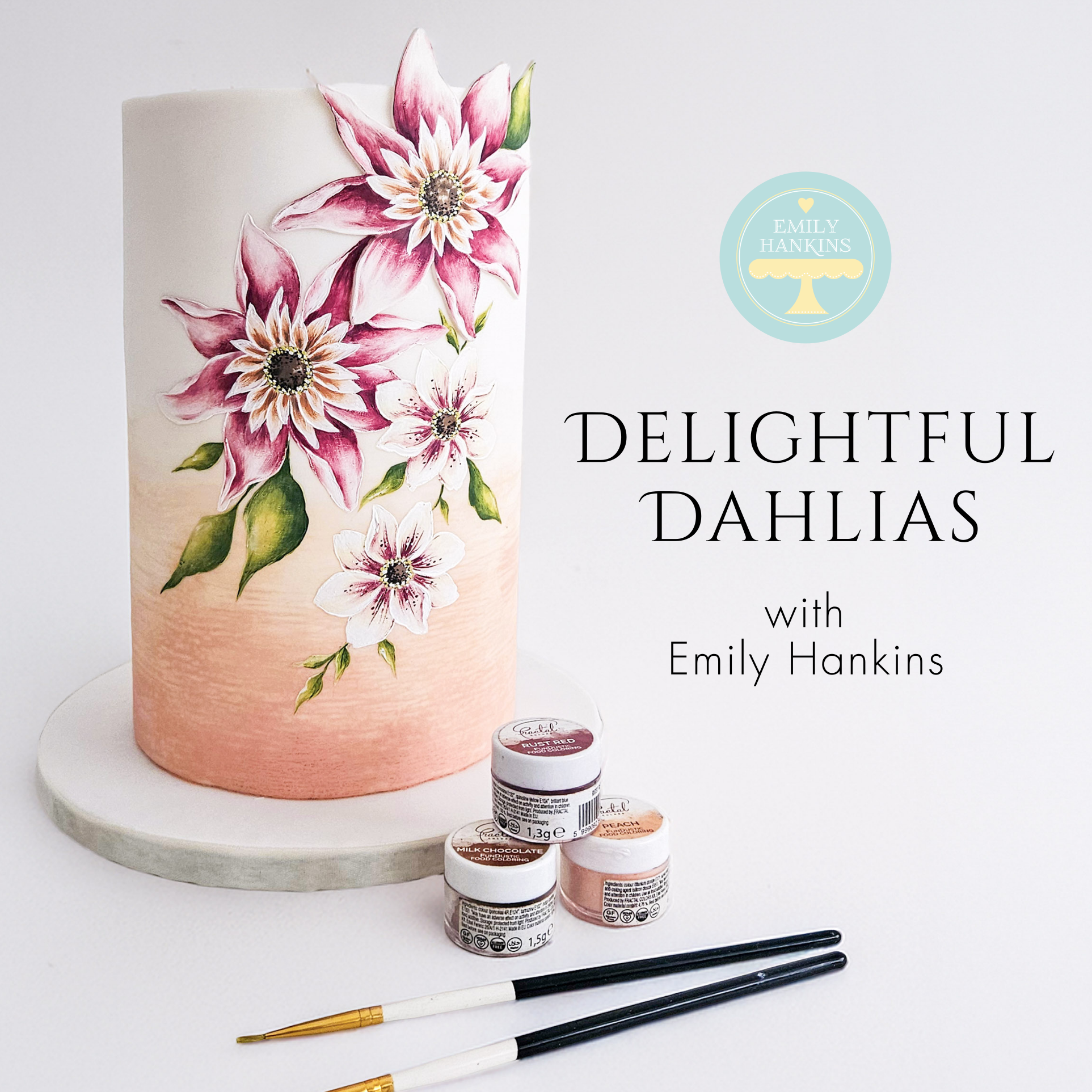 Join me at Cake International for a day of cake painting, creating this ‘Delightful Dahlia’ design on a tall and elegant sugarpaste covered cake tier.